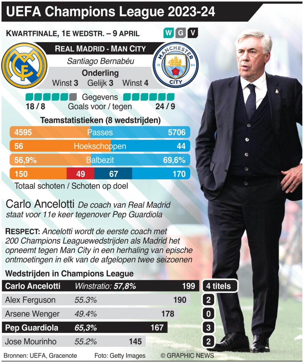 9 april 2024 – UEFA Champions League kwartfinale heenwedstrijden, inclusief wedstrijden tussen Real Madrid en Man City in het Santiago Bernabéu Stadion, Madrid. De loting voor de halve finales van de UEFA Champions League vond op 15 maart plaats in Nyon, Zwitserland.