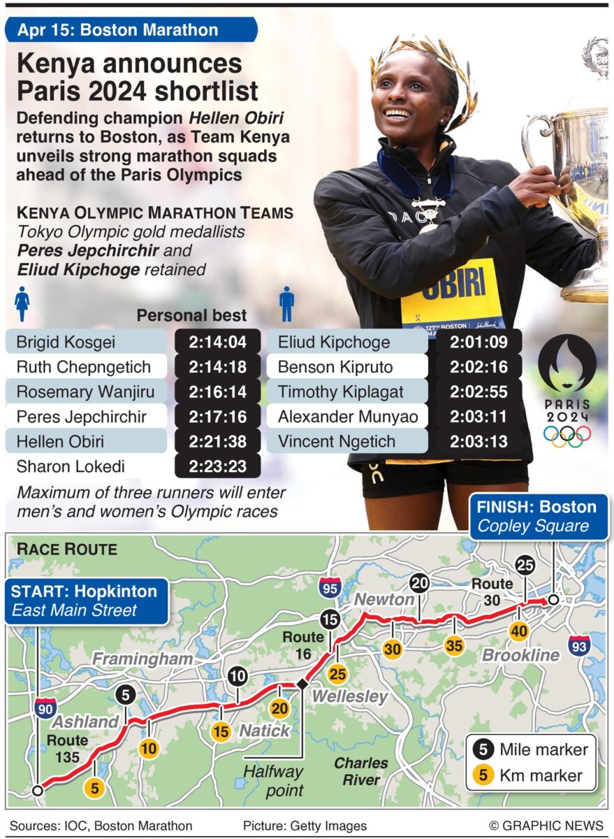 15 april 2024 – De 128e Boston Marathon, ’s werelds oudste jaarlijkse marathon. Titelverdediger Hellen Obiri keert terug naar Boston, terwijl Team Kenia sterke marathonselecties onthult voorafgaand aan de Olympische Spelen in Parijs.