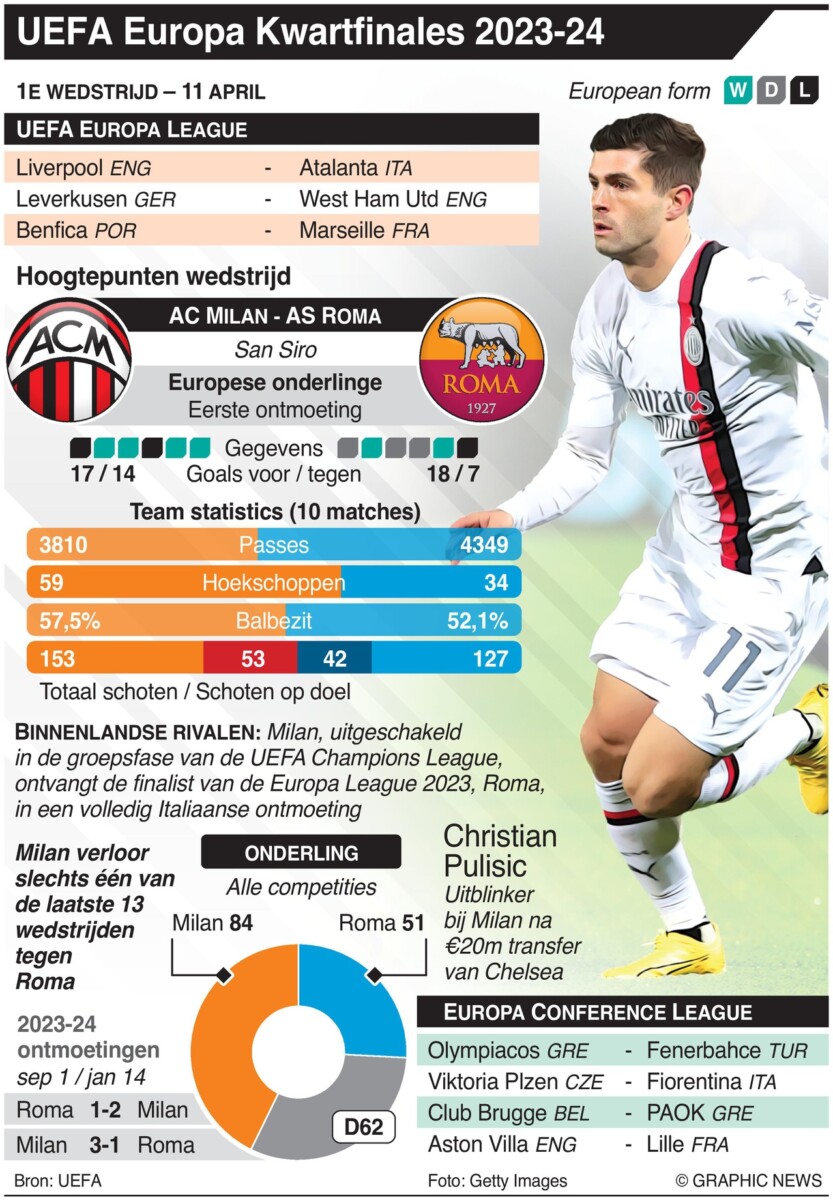 11 april 2024 – De Europa League en Europa Conference League van de UEFA bereiken de kwartfinales, waarbij teams strijden om een plaats in de halve finales van beide toernooien. In de Europa League ontmoet Liverpool Atlanta, terwijl AC Milan het opneemt tegen AS Roma in een volledig Italiaanse ontmoeting. Tot de UEFA Conference League-wedstrijden behoren Olympiacos tegen Fenerbahce en Aston Villa tegen Lille.