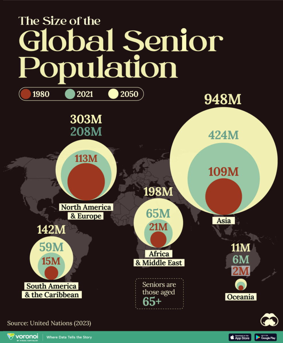 Het World Social Report 2023 van de Verenigde Naties illustreert dat de wereldwijde bevolking van 65 jaar en ouder aanzienlijk is toegenomen tussen 1980 en 2021 en waarschijnlijk nog verder zal stijgen tot 2050. Deze toename is vooral merkbaar in Europa, Noord-Amerika, Australië, Nieuw-Zeeland en delen van Azië, waar de ouderenpopulatie in sommige gevallen zelfs 20% van de totale bevolking bedraagt.