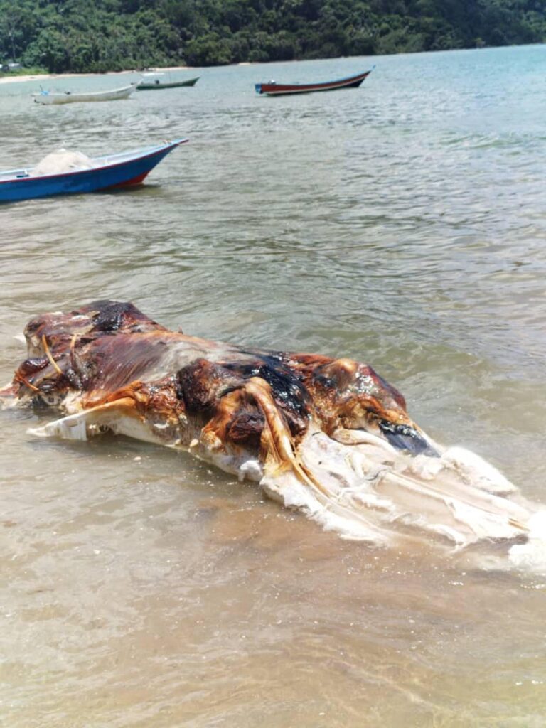 Aan de kust in Maleisië is een op het eerste oog onherkenbaar dier aangespoeld. Het is een enorme massa rottend vlees met iets wat lijkt op klauwen. De lokale strandwachten die het 1.80 meter grote stinkende exemplaar op de Melano Bay Beach aantroffen, vermoeden dat het de restanten zijn van een walvis.