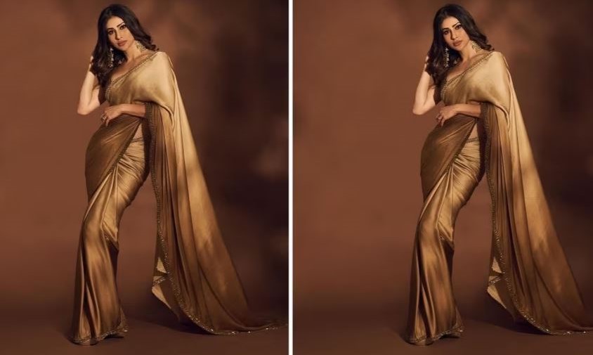 Mouni Roy ademt tijdloze elegantie en etnische charme uit in haar nieuwste look, gepresenteerd in een oogverblindende gouden sari. Ze kiest voor een luxueuze satijnen stof, versierd met gouden pailletten, gedragen met een mouwloze bruine blouse, voor een verbluffend effect.