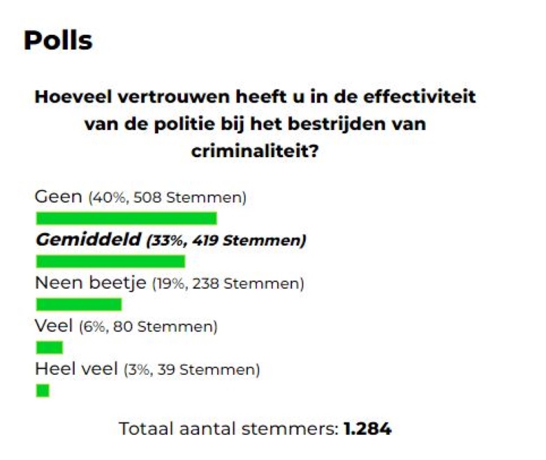 Slechts 3% (39 stemmen) geeft aan ‘heel veel’ vertrouwen te hebben, terwijl 6% (80 stemmen) aangeeft ‘veel’ vertrouwen te hebben in de politie. Een ‘gemiddeld’ vertrouwen wordt uitgesproken door 33% (419 stemmen) van de stemmers. ‘Een beetje’ vertrouwen is er bij 19% (238 stemmen), en maar liefst 40% (508 stemmen) van de deelnemers aan de peiling heeft ‘geen’ vertrouwen in de effectiviteit van de politie bij het bestrijden van criminaliteit.