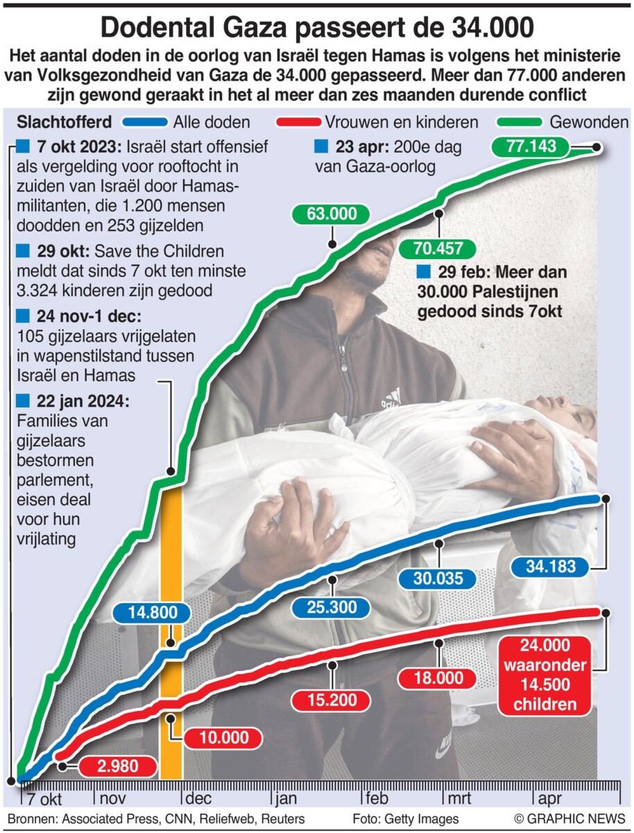 April 23, 2024 – Volgens het ministerie van Volksgezondheid van Gaza is het aantal doden in de Israëlische oorlog tegen Hamas de 34.000 gepasseerd. Ruim 77.000 anderen zijn gewond geraakt tijdens het ruim zes maanden durende conflict.