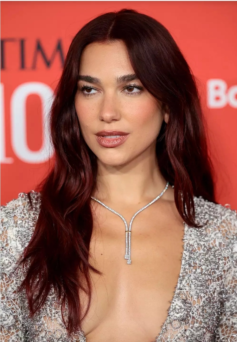 Ze droeg een paar sierlijke diamanten ringen, evenals een halsketting met diamanten strengen die de twee uiteinden met elkaar verbond en tussen de diepe halslijn rustte. Lipa’s rode haar was gestyled in een uitbarsting met losse golven, en ze droeg een roze make-uplook van roze blos en donkerroze lipgloss, wat ook haar vurige haarkleur accentueerde.