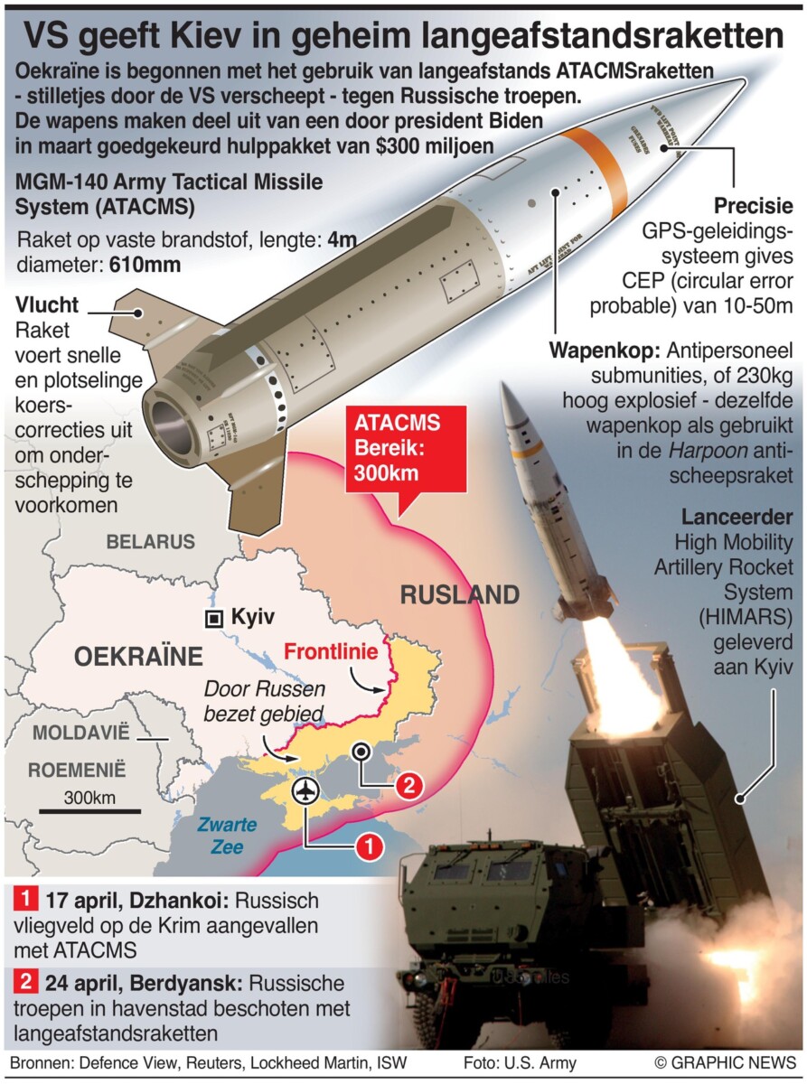 De langeafstandsraketten werden voor het eerst gebruikt in de vroege uren van 17 april en werden gelanceerd tegen een Russisch vliegveld op de Krim dat ongeveer 165 km verwijderd was van de Oekraïense frontlinies, citeerde persbureau Reuters een niet bij naam genoemde Amerikaanse functionaris.