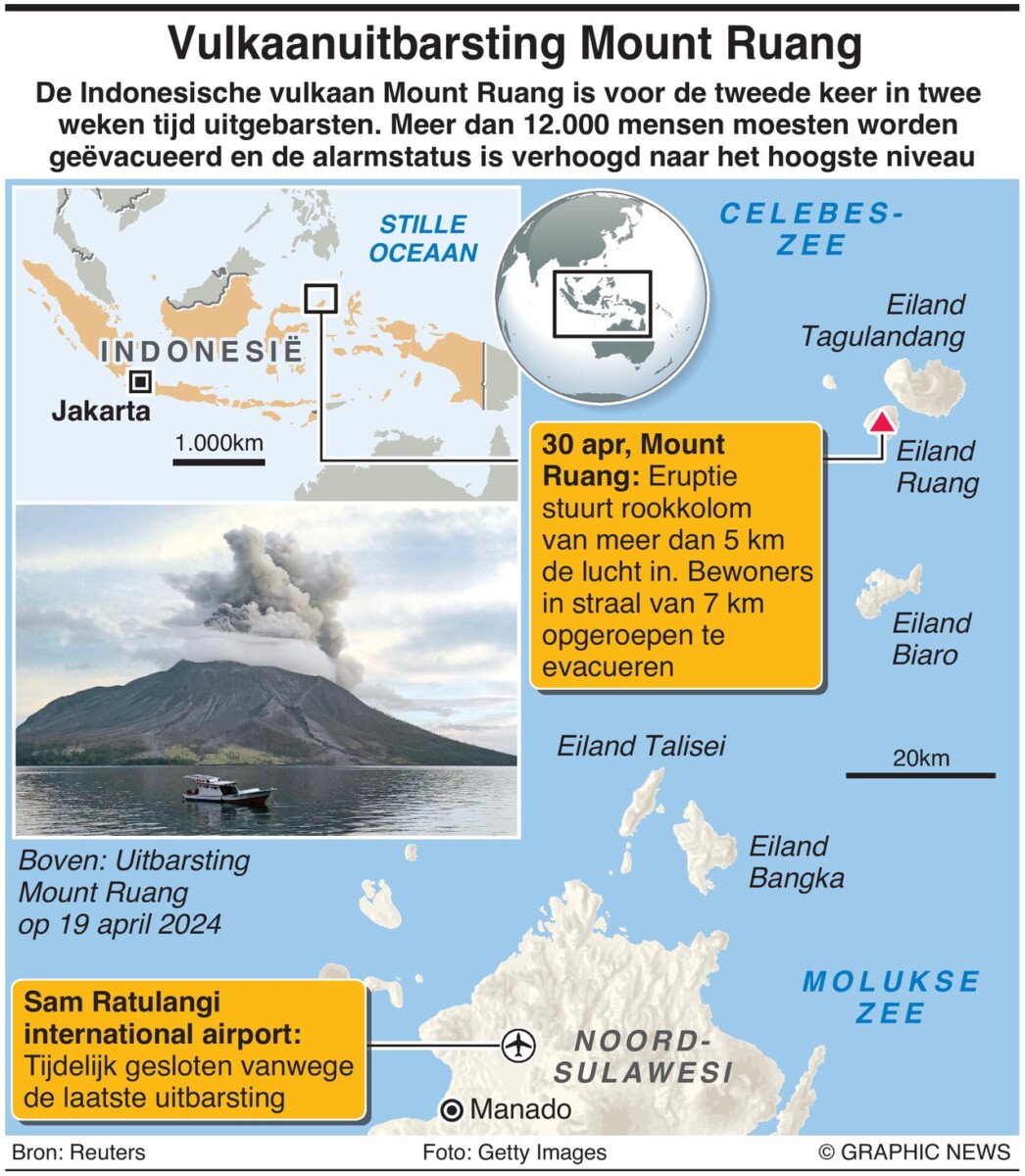 De uitbarsting volgt op een reeks uitbarstingen eerder deze maand, waardoor honderden mensen moesten evacueren en de luchthaven in de provinciehoofdstad Manado moest sluiten. Die uitbarsting veroorzaakte ook schade aan sommige huizen. Destijds waarschuwde de vulkanologie ook voor de mogelijkheid van een tsunami, aldus Reuters.