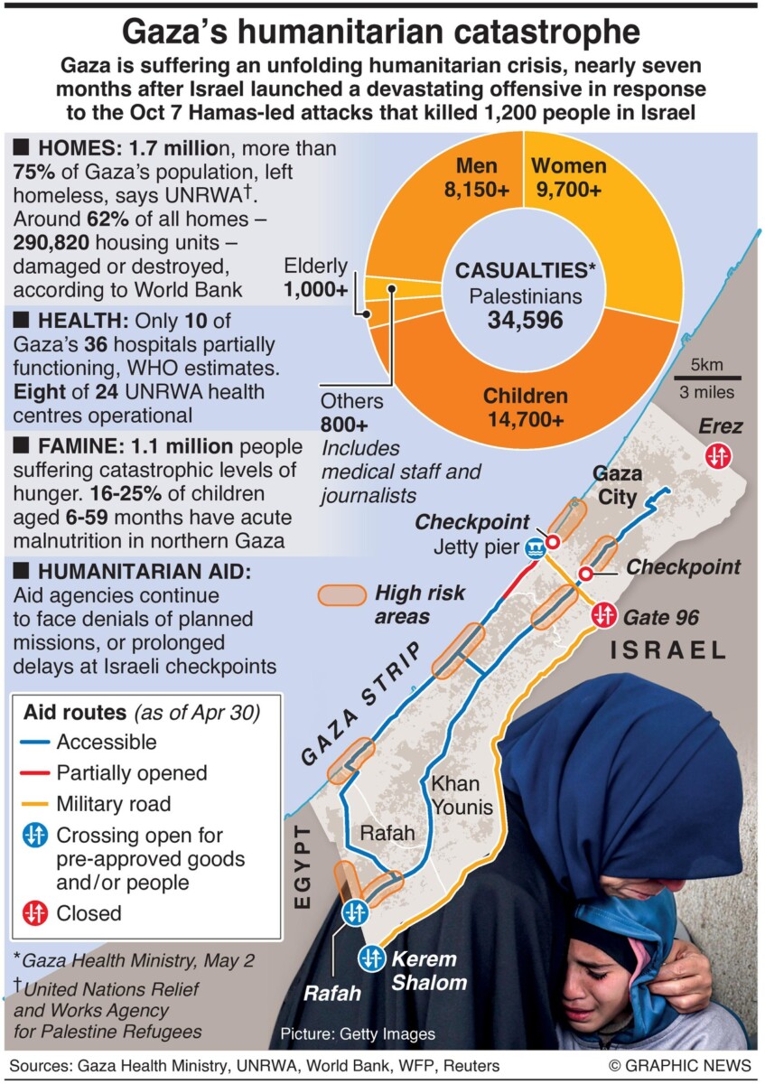 May 2, 2024 – Gaza lijdt onder een zich ontvouwende humanitaire crisis, bijna zeven maanden nadat Israël een verwoestend offensief lanceerde als reactie op de door Hamas geleide aanvallen van 7 oktober waarbij 1.200 mensen in Israël omkwamen.