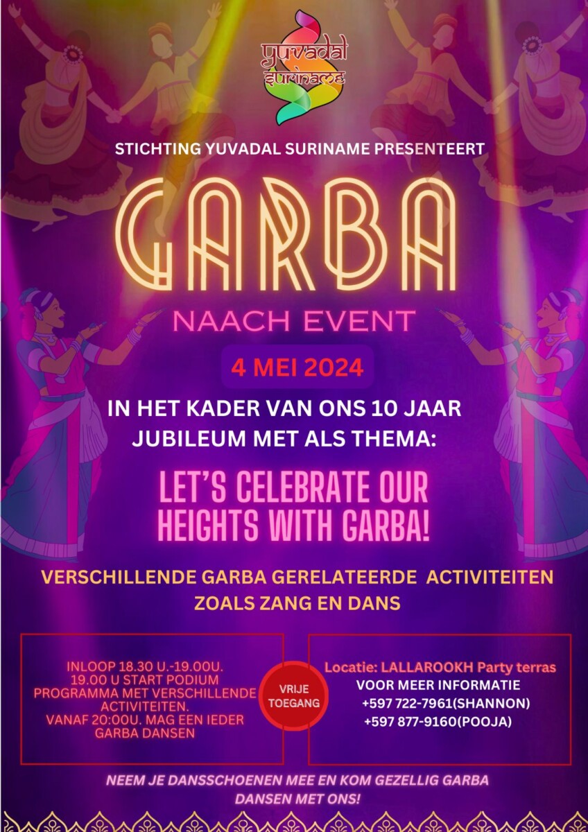 Stichting Yuvadal Suriname organiseert een ‘Garba Naach event’ in het kader van hun 10-jarig bestaan, met als thema ‘Let’s celebrate the heights with Garba’.