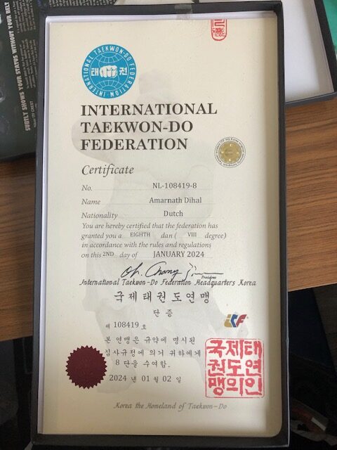 Amar Dihal, 72, ontving vorige maand via de Internationale Taekwondo Federatie (ITF) zijn 8e dan Taekwondo diploma. Hiermee heeft Dihal zich gevoegd bij een select gezelschap van Taekwondoka’s, die beschikken over deze graduatie. Achtste danners zijn op de vingers van één hand te tellen.