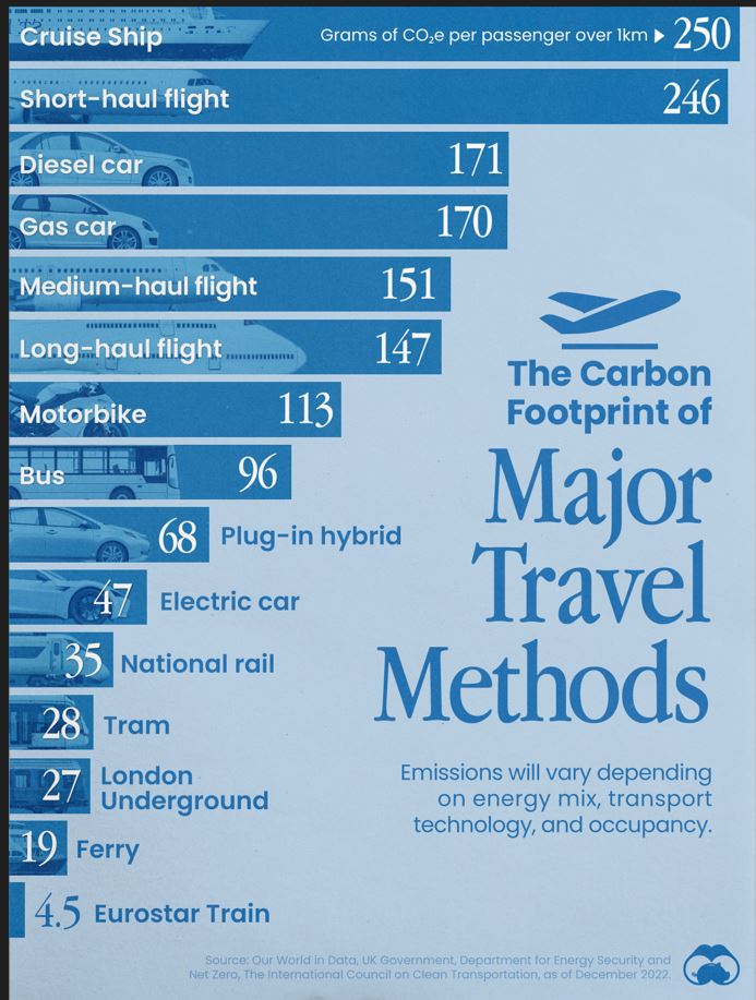 Recent onderzoek toont de CO2-voetafdruk van verschillende transportmethoden, waarbij cruiseschepen, korteafstandsvluchten en solitair autorijden als de meest koolstofintensieve methoden worden beschouwd.