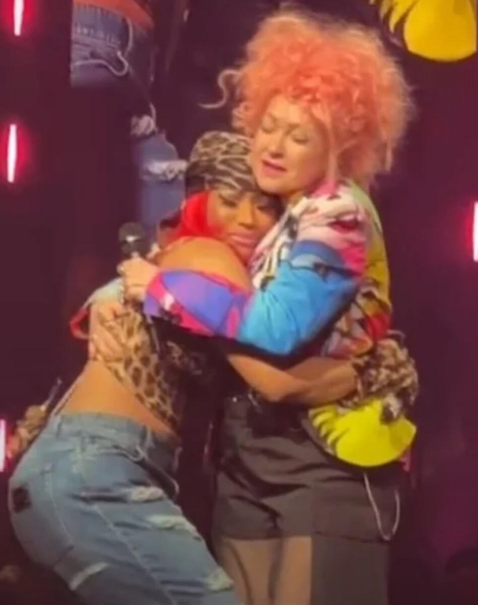 Lauper en Minaj speelden voor het eerst samen ‘Pink Friday Girls’, waarin het anthem ‘Girls Just Wanna Have Fun’ uit 1983 zwaar wordt gesampled. Minaj rockte een spijkerbroek en een top met luipaardprint, terwijl het publiek in rep en roer raakte toen Lauper op het podium verscheen in een kleurrijke blazer en een kanten broek. Ze hielden elkaars hand vast en deelden een warme omhelzing na het optreden terwijl Minaj haar liefde toonde aan het 70-jarige popicoon.