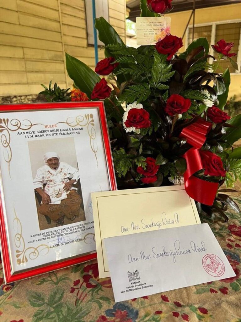 Mevrouw Louisa Asirah Soerokarijo heeft zondag 5 mei haar 100e verjaardag mogen vieren. Zij is geboren op 5 mei 1924 in het district Saramacca, en groeide op op plantage Volharding en Blijdschap aan de linkeroever van de Saramaccarivier.