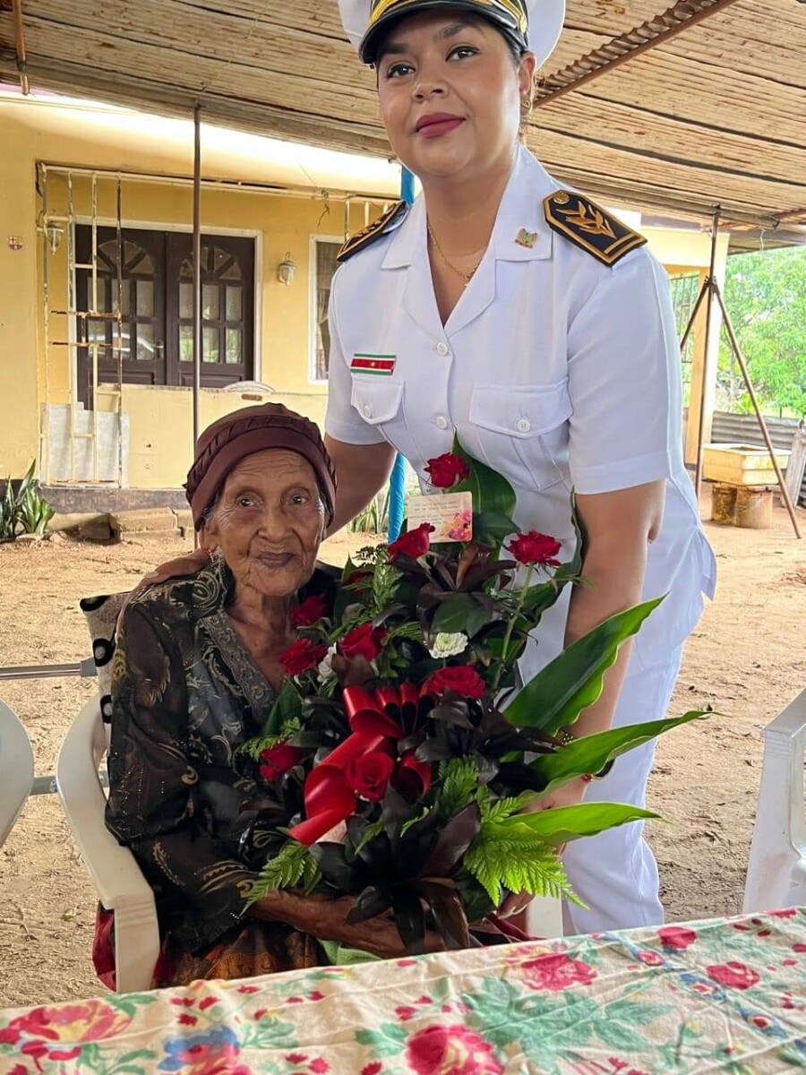 Districtscommissaris van Saramacca mevrouw Sherin Bansi-Durga heeft mede namens de regering, de felicitaties middels een bloemstuk, een felicitatiekaart, een ingelijste foto en de gebruikelijke enveloppe met inhoud overhandigd.