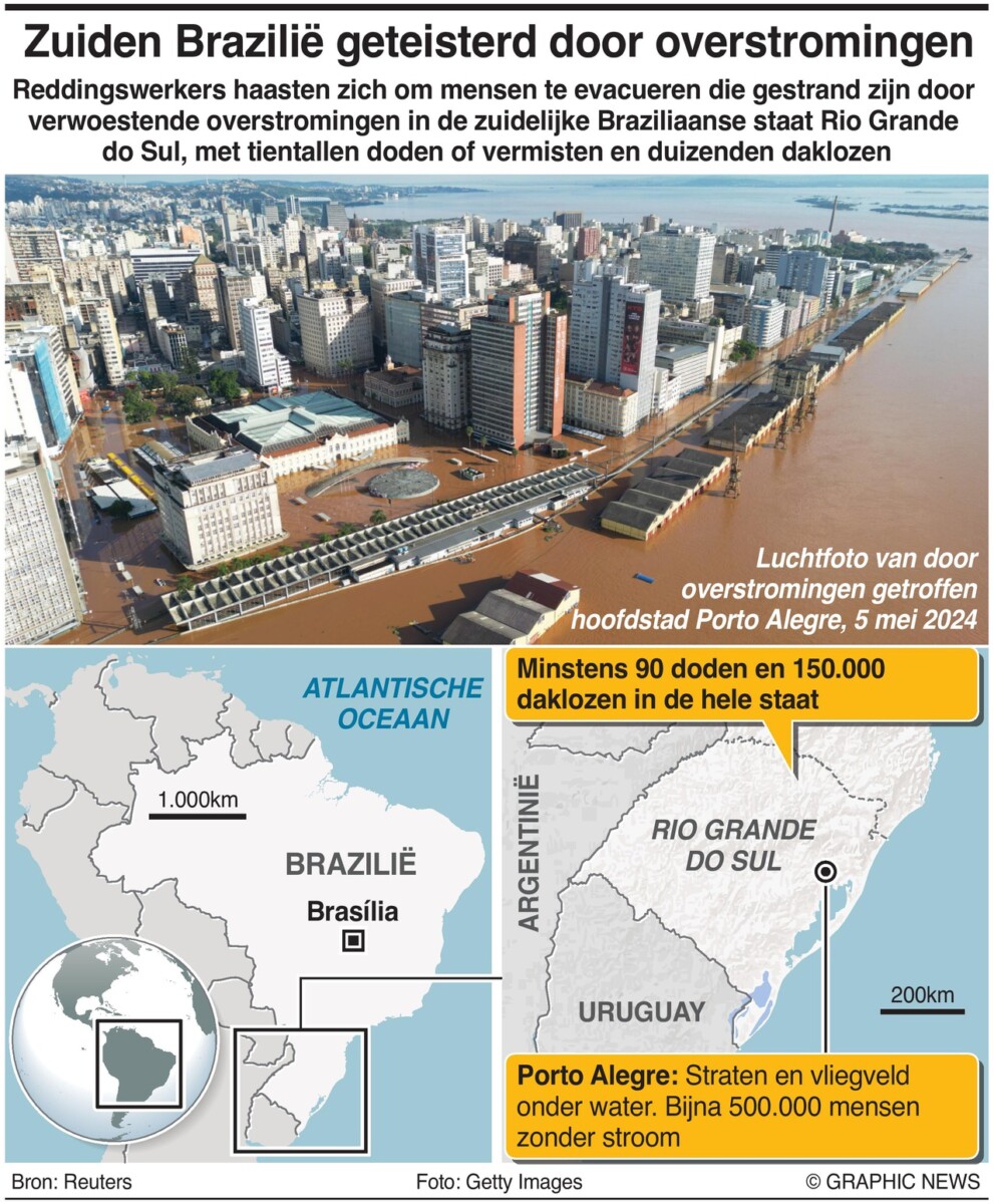 Reddingswerkers evacueren mensen die zijn gestrand door verwoestende overstromingen in de Braziliaanse staat Rio Grande do Sul, waarbij minstens 90 mensen om het leven zijn gekomen en duizenden dakloos zijn geworden.