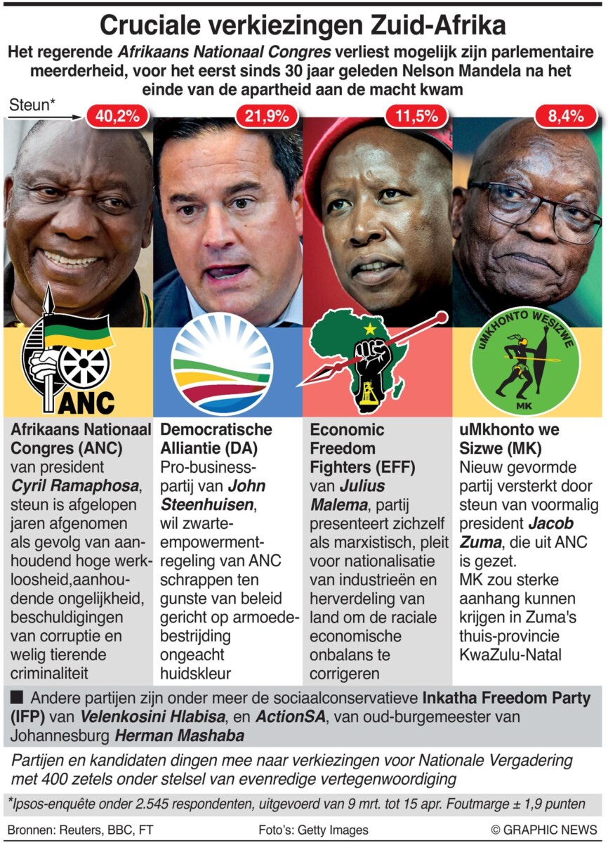 29 mei 2024 – Het regerende African National Congress verliest mogelijk voor het eerst zijn parlementaire meerderheid sinds Nelson Mandela aan de macht kwam na het einde van de apartheid dertig jaar geleden.