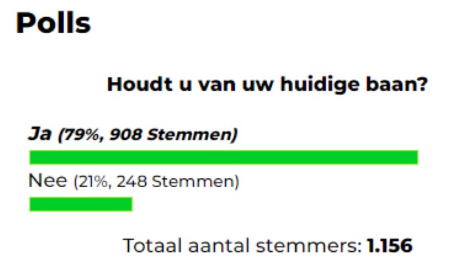 Daarentegen blijkt 21% (248 stemmen) ontevreden te zijn over hun werk. Deze resultaten suggereren een relatief hoge mate van beroepstevredenheid onder de deelnemers aan de peiling.