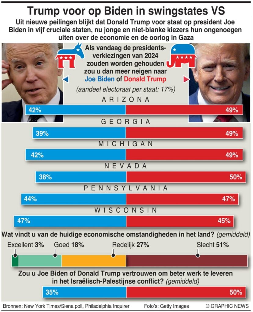 May 14, 2024 – Uit nieuwe peilingen blijkt dat Donald Trump president Joe Biden leidt in vijf cruciale strijdtonelen, terwijl jonge en niet-blanke kiezers hun onvrede uiten over de economie en de oorlog in Gaza.