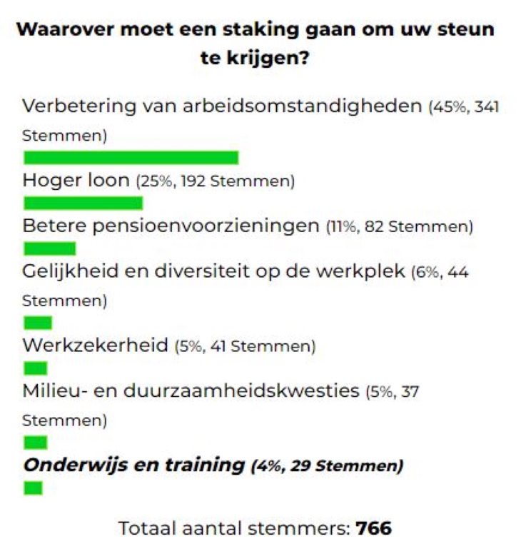 Hoger loon volgt met 25% (192 stemmen), terwijl betere pensioenvoorzieningen 11% (82 stemmen) van de stemmen kreeg.