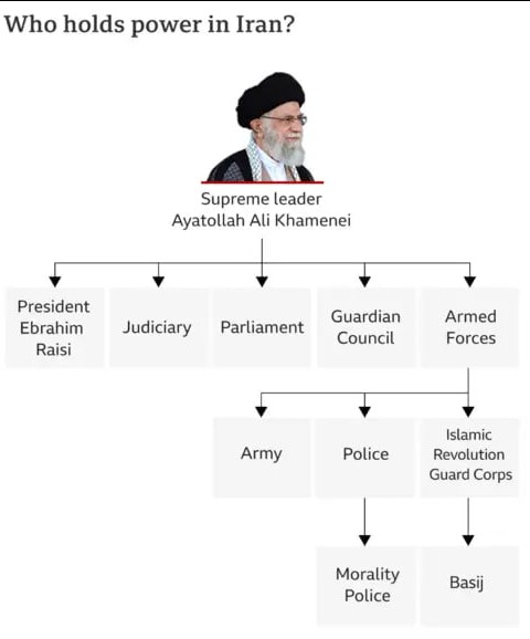 ▪️Opperste Leider: De machtigste positie wordt ingenomen door de Opperste Leider, momenteel Ayatollah Ali Khamenei. De opperste leider is de hoogste seculiere en religieuze autoriteit in het land en heeft de macht over de Iraanse regering, het leger en de rechterlijke macht.