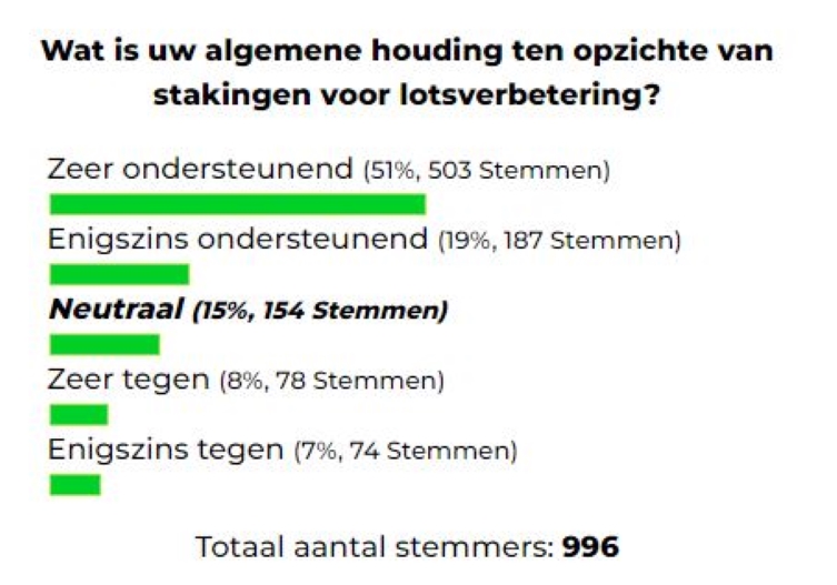 Een webpeiling van Dagblad Suriname onthult dat de meerderheid van de respondenten positief staat tegenover stakingen gericht op lotsverbetering. Uit de enquĂȘte blijkt dat 51%, wat overeenkomt met 503 stemmen, âZeer Ondersteunendâ is.