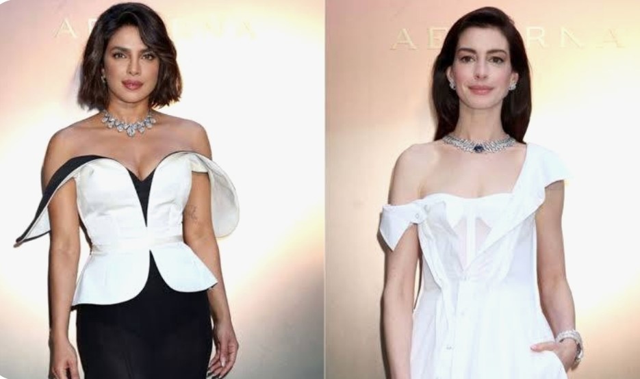 Priyanka poseert met Anne Hathaway in een prachtig off-shoulder ensemble en een indrukwekkende 140-karaats diamanten halsketting.