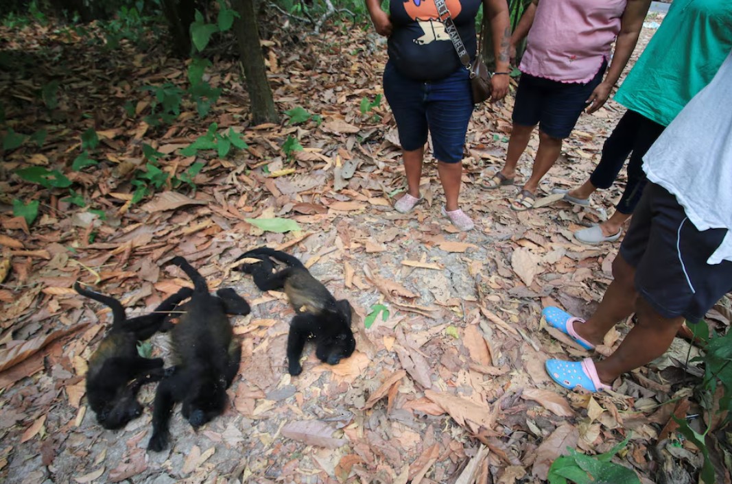 In de staat Tabasco zal de temperatuur deze week naar verwachting de 45 graden Celsius zal overschrijden In een bos buiten Camalcalco, Tabasco, verzamelden vrijwilligers de lijken van mantelbrulaapjes (alouatta palliata) die stierven door hoge temperaturen, voordat ze emmers water en fruit plaatsten om te proberen nog meer sterfgevallen te voorkomen.