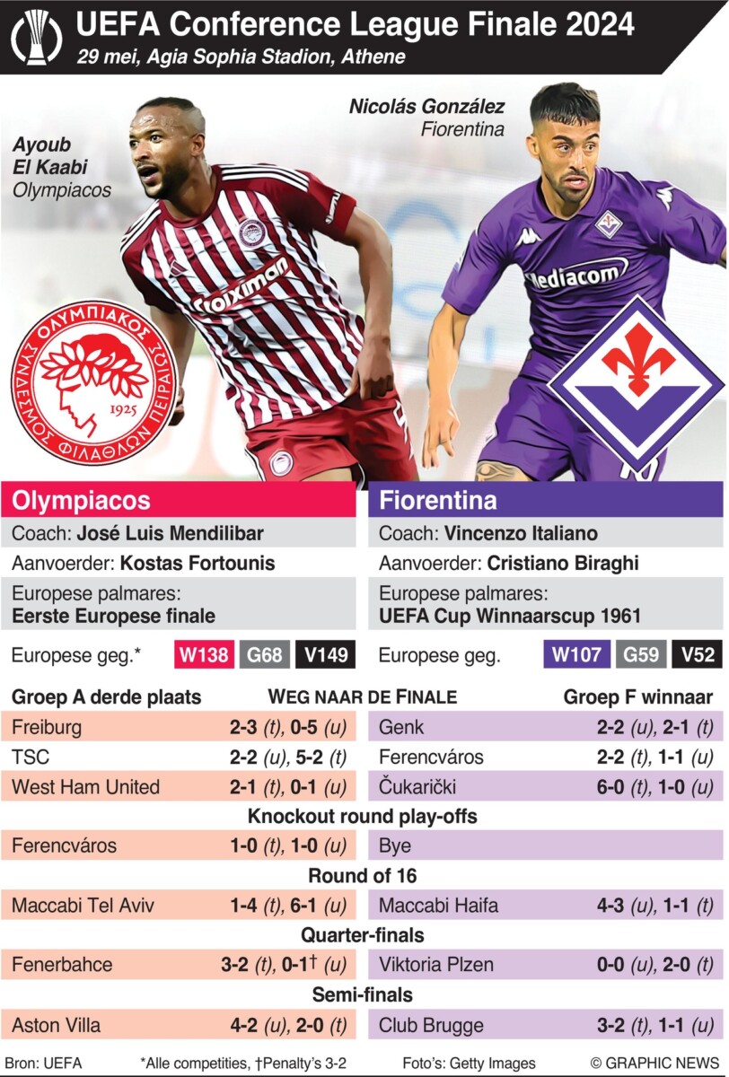 29 mei 2024 – De finale van de UEFA Europa Conference League vindt plaats tussen het Italiaanse Serie A-team Fiorentina en het Griekse team Olympiacos