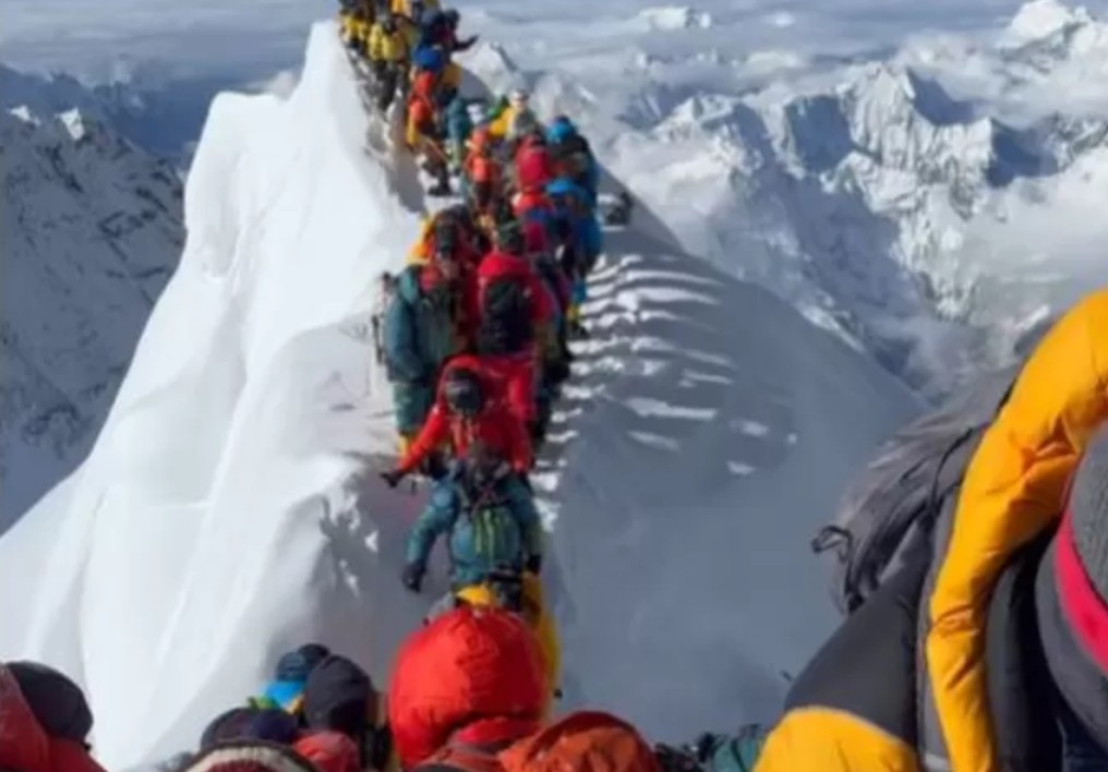 Op een video van berggids Vinaya Malla is te zien hoe zeker een twintigtal bergbeklimmers achter elkaar staat te wachten onder de top van de hoogste berg ter wereld: