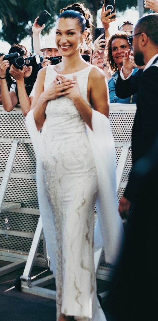 Het is het derde Versace-ensemble dat het supermodel deze week draagt. Bella Hadid sloot haar stijlreeks in Cannes af met een groot vintage-moment. Nadat ze uitstapte in een gouden mini-jurk uit de jaren ’90 van Versace, koos het supermodel voor een romantische, geheel witte jurk uit de voorjaarscollectie van 1998 van Atelier Versace.
