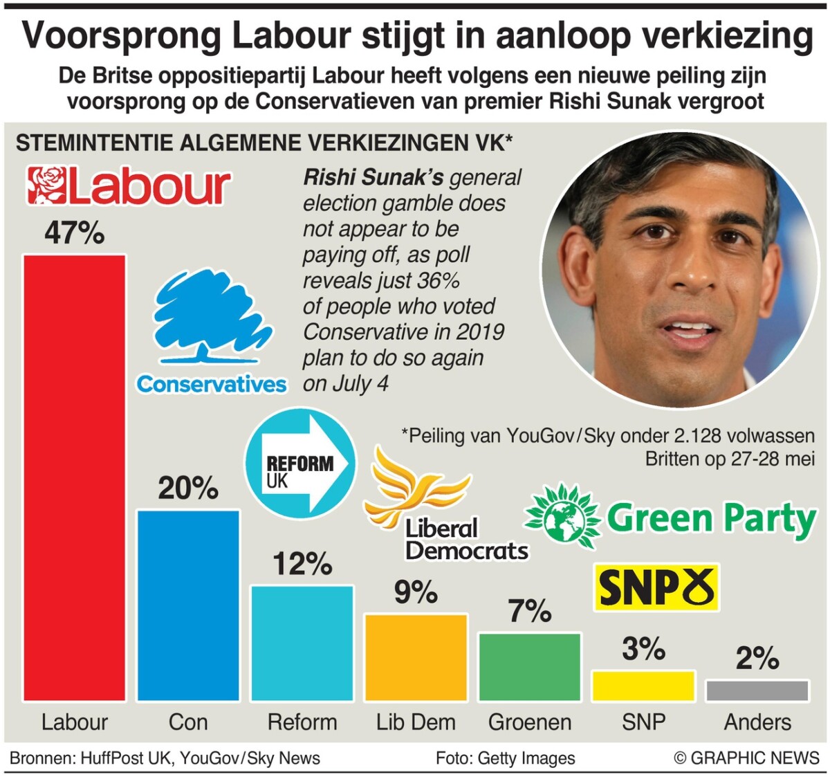 De peiling in Groot-Brittannië – deze week maandag en dinsdag gehouden – schat Labour op 47%, de Tories op 20%, Hervorming op 12%, de Liberaal-Democraten op 9% en de Groenen op 7%.