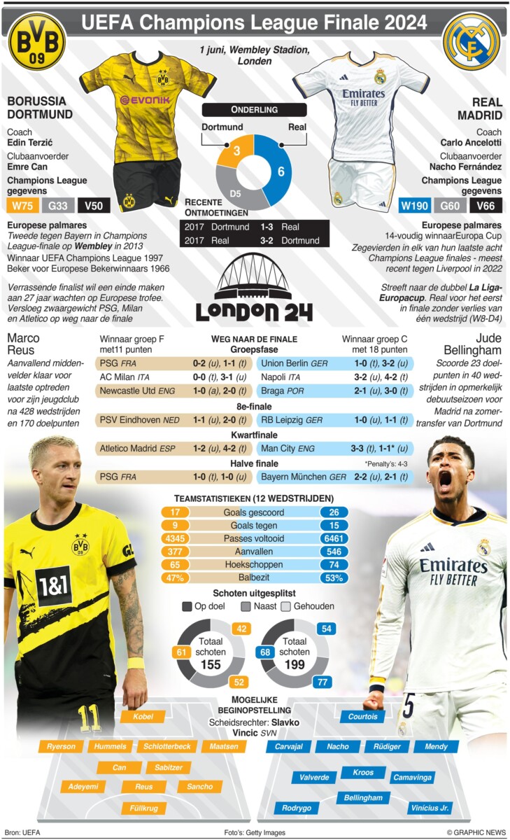June 1, 2024 – De UEFA Champions League-finale vindt plaats tussen de Duitse Bundesliga-zwaargewichten Borussia Dortmund en de Spaanse veertienvoudig Europacup-winnaar Real Madrid, in het Londense Wembley Stadion op 1 juni 2024.