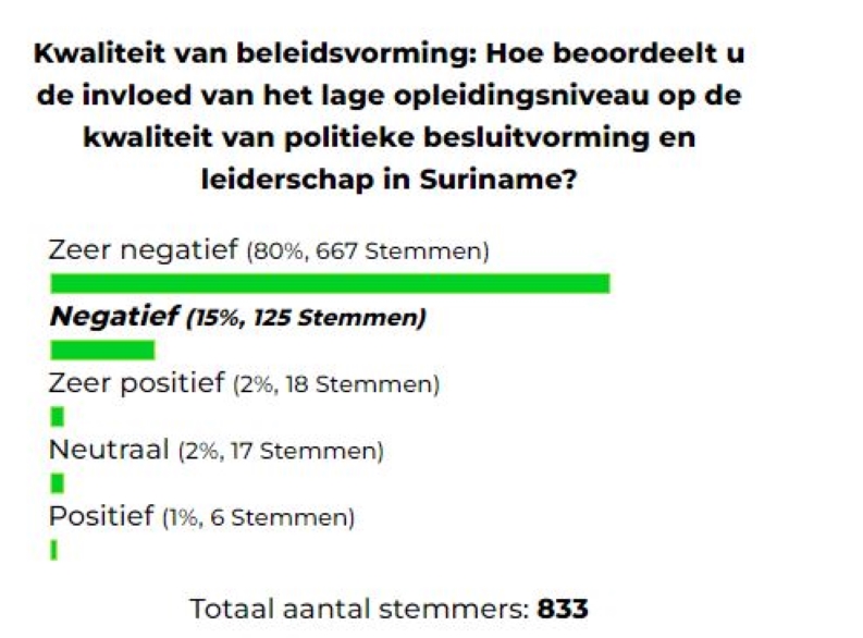 Dagblad Suriname voerde recent een webpeiling uit om de publieke opinie te meten over de invloed van een laag opleidingsniveau op de kwaliteit van politieke besluitvorming en leiderschap in Suriname. De resultaten laten een overwegend negatieve perceptie zien.