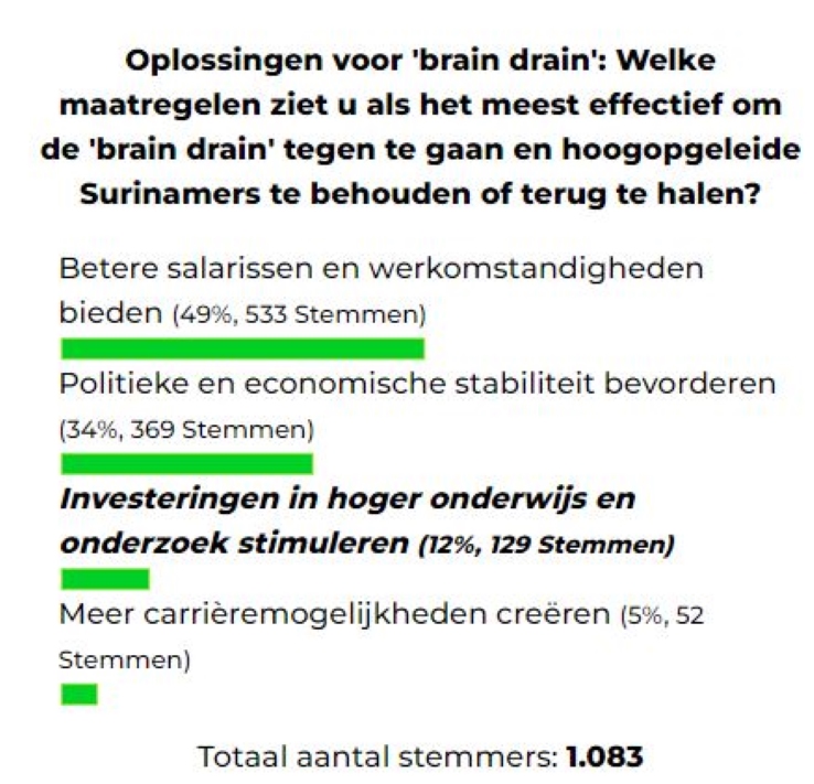 Dagblad Suriname heeft een webpeiling gehouden over de meest effectieve maatregelen om de ‘brain drain’ tegen te gaan en hoogopgeleide Surinamers te behouden of terug te halen. De resultaten zijn binnen en geven een duidelijk beeld van de prioriteiten van de respondenten: