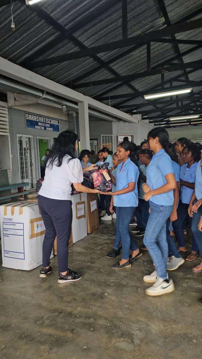 Namens initiatiefnemers Pritha Maheswari van yogastudio Mahé Yoga en Sham Hira van de Stichting Sociaal Culturele Activiteiten Zoetermeer (SSCAZ) is Kathleen Laiafat bereid gevonden om de tassen te overhandigen aan de scholieren. Kathleen is geen onbekende: als oud-Zoetermeerse én eerste karma yogi (vrijwilliger) bij Mahé Yoga, was zij de meest voor de hand liggende persoon om in Suriname deze mooie taak uit te voeren.