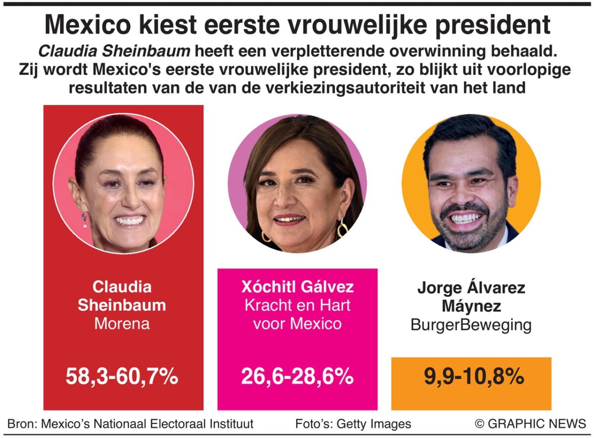 Sheinbaum won het presidentschap met tussen de 58,3% en 60,7% van de stemmen, volgens een snelle steekproeftelling door de Mexicaanse kiesautoriteit. Dat zal naar verwachting het hoogste stempercentage zijn in de democratische geschiedenis van Mexico.