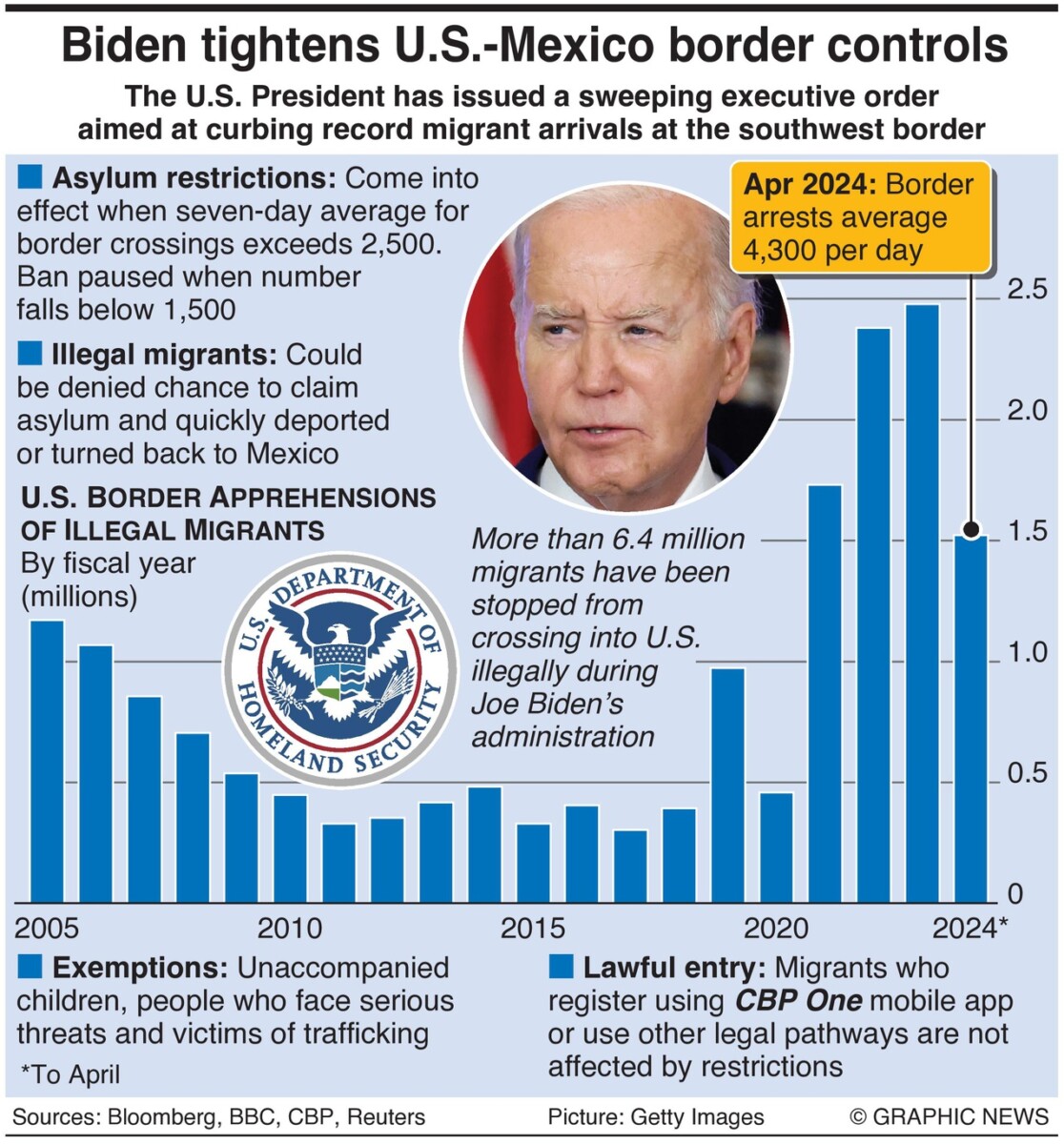 June 5, 2024 – President Joe Biden heeft een breed asielverbod uitgevaardigd voor migranten die betrapt worden op het illegaal oversteken van de grens tussen de VS en Mexico, een belangrijke handhavingsmaatregel voorafgaand aan de verkiezingen in november.