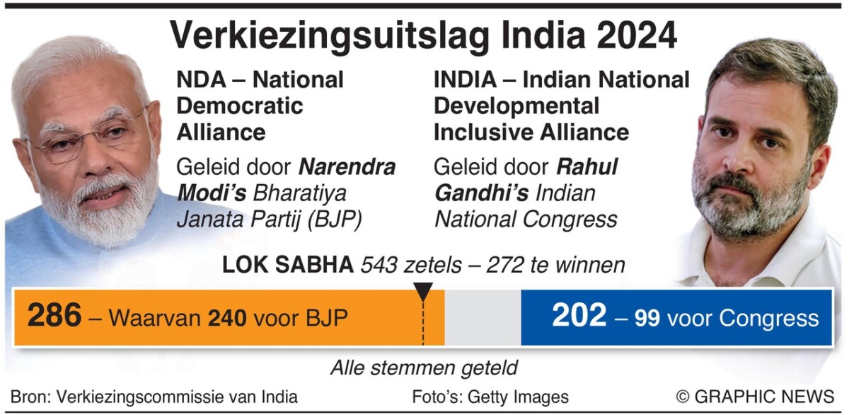 De National Democratic Alliance van Modi behaalde 272 van de 543 zetels in het parlement, net genoeg voor een meerderheid. Dit is wel minder dan de 303 zetels in 2019. De Congrespartij, de belangrijkste oppositie, won 88 zetels en leidt in elf districten, een verdubbeling van hun vorige resultaten. De verkiezingen, waarbij 642 miljoen mensen stemden, markeren een wereldrecordondanks een lagere opkomst door de hittegolf.