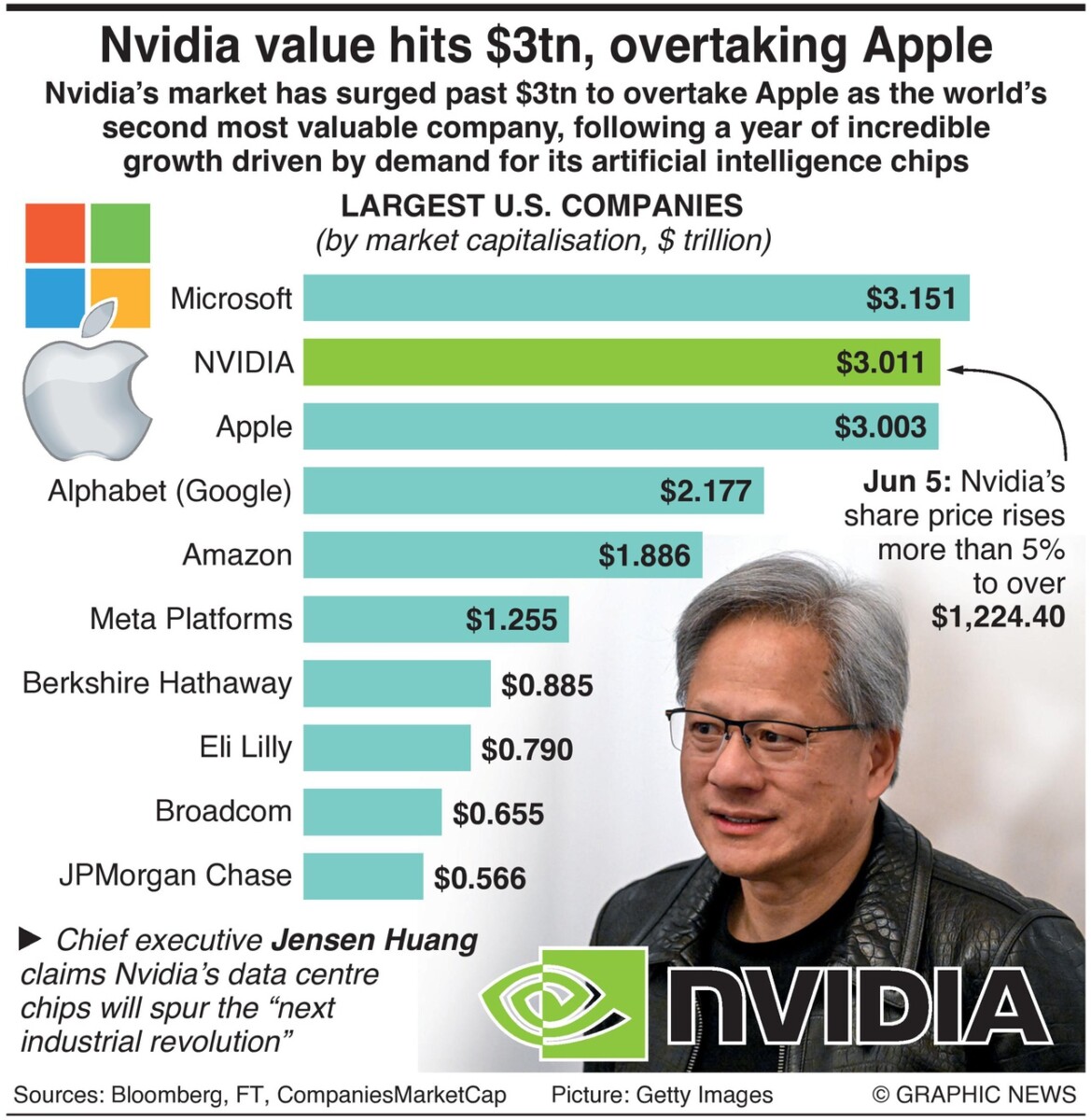 De aandelen van de chipmaker stegen met 5,16% naar $1.224,40, wat Nvidia bij het sluiten van de markt een marktwaarde van $3,01 biljoen opleverde. De marktkapitalisatie van Apple bedroeg bij het sluiten van de markt $3,00 biljoen, terwijl het aandeel met 0,78% steeg.