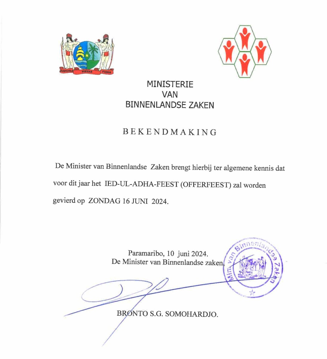 Ied-ul-Adha feest dit jaar zondag 16 juni Geplaatst op juni 10, 2024juni 10, 2024 Bericht navigatie VorigePresident Santokhi met delegatie vertrokken naar de Bahama’s voor bijeenkomst met AfreximbankVolgende41-jarige bromfietsdief aangehouden door politie Livorno