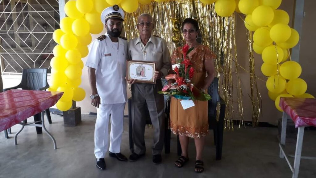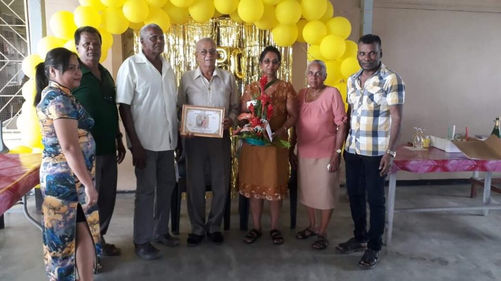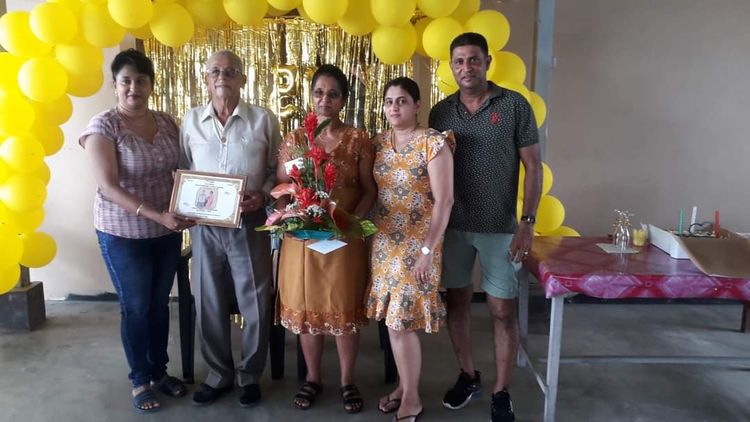 De districtscommissaris van Commewijne, Mohamedsafiek Radjab, bracht namens president Chandrikapersad Santokhi en de First Lady de felicitaties over en overhandigde een bloemstuk, een ingelijste foto en de gebruikelijke gesloten enveloppe met inhoud aan het echtpaar.