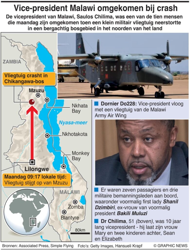 Een vliegtuig met daarin de Malawi-vicepresident Saulos Chilima en negen anderen is vermist1234. Het vliegtuig van de Malawi Defence Force verdween maandagochtend “van de radar” nadat het de hoofdstad Lilongwe verliet13. Er wordt gezocht naar het vermiste vliegtuig.