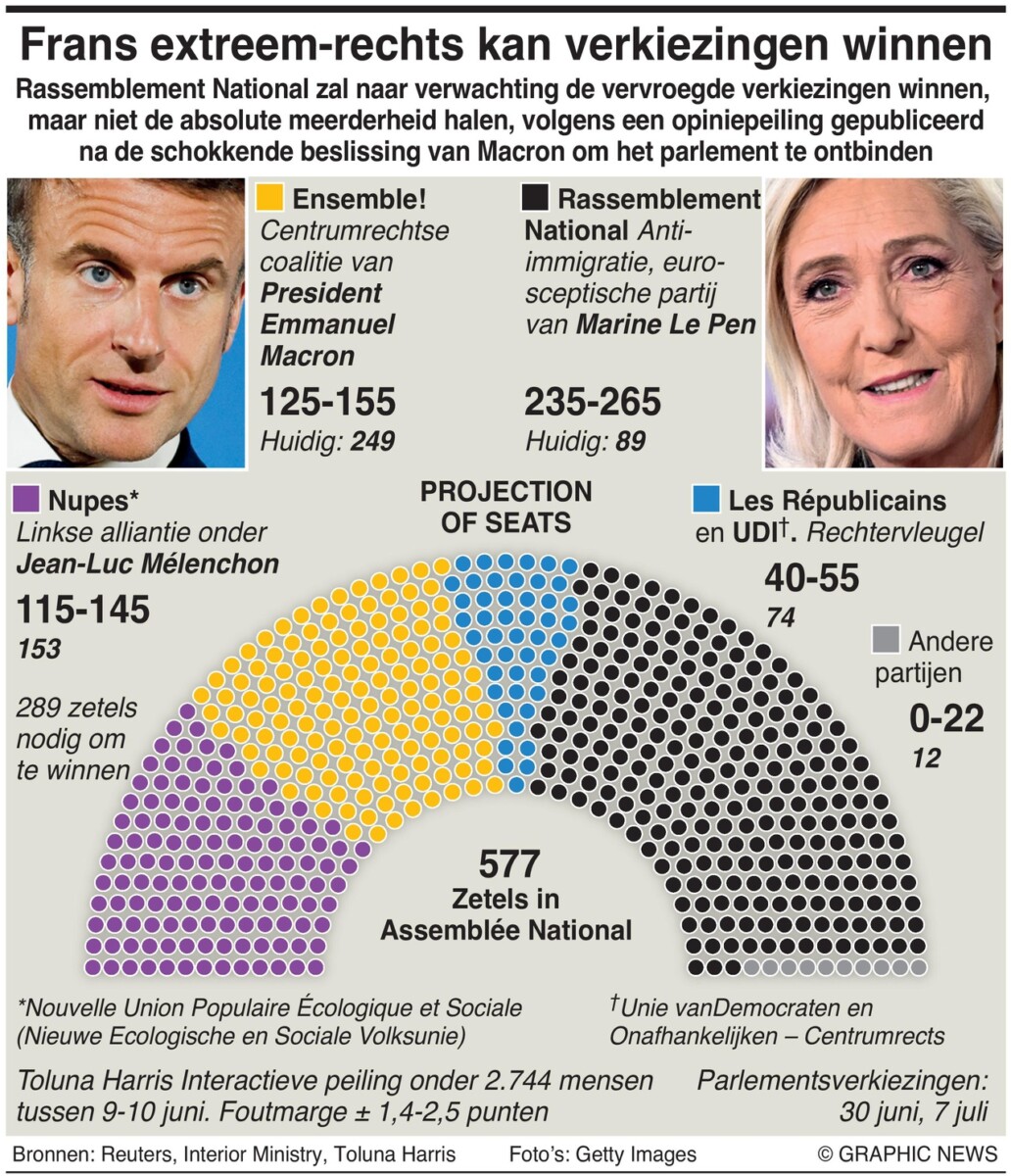 June 11, 2024 – Extreemrechts zal naar verwachting de vervroegde verkiezingen winnen, maar zal geen absolute meerderheid halen, blijkt uit een opiniepeiling die werd gepubliceerd na het besluit van president Macron om het parlement te ontbinden.
