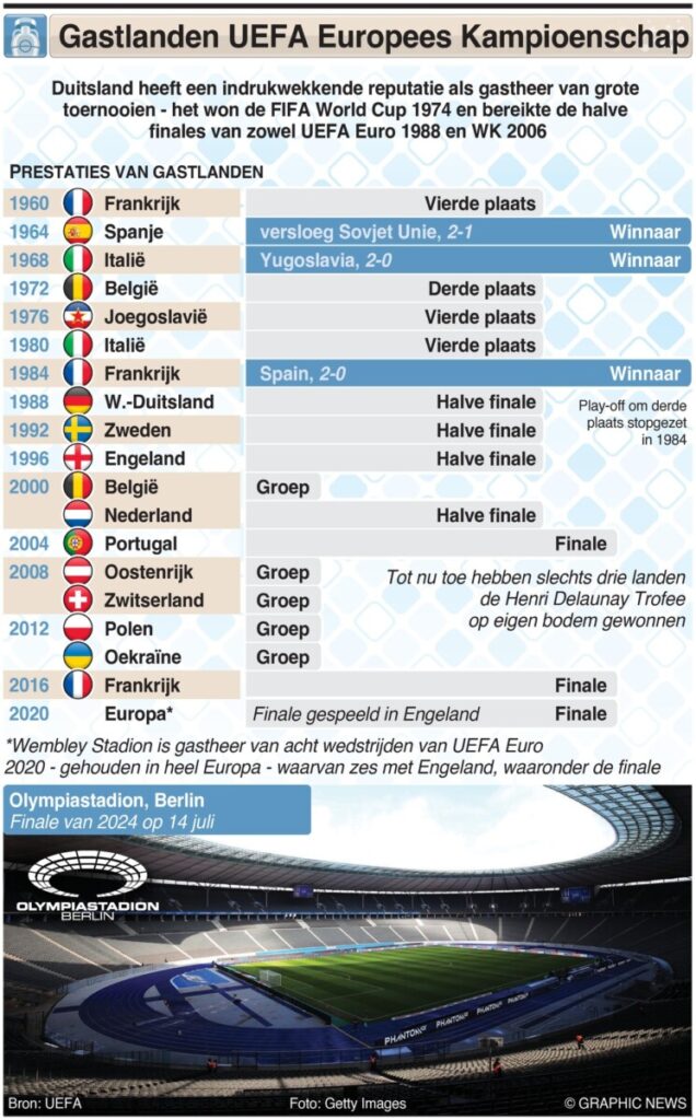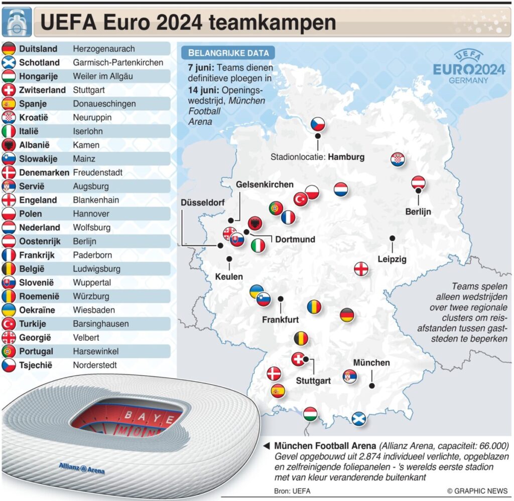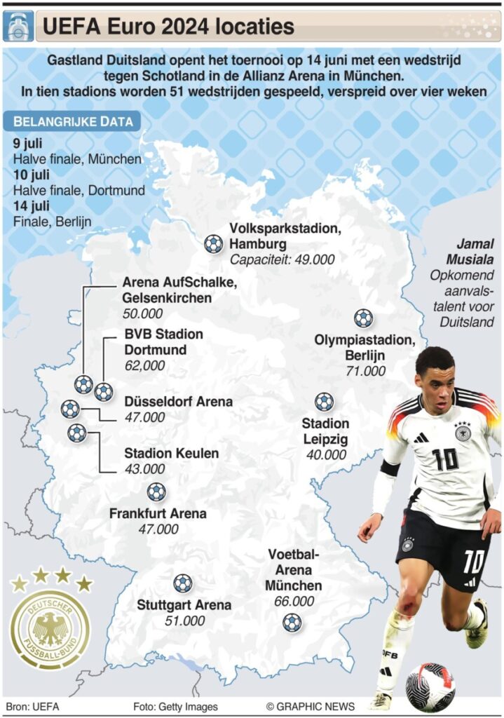 14 juni 2024 – 14 juli 2024 – Duitsland is gastheer van de 17e editie van de UEFA European Championships, het eerste grote toernooi sinds de FIFA Wereldbeker 2006. De voetbalarena van München lanceert het paradepaardje op 14 juni.
