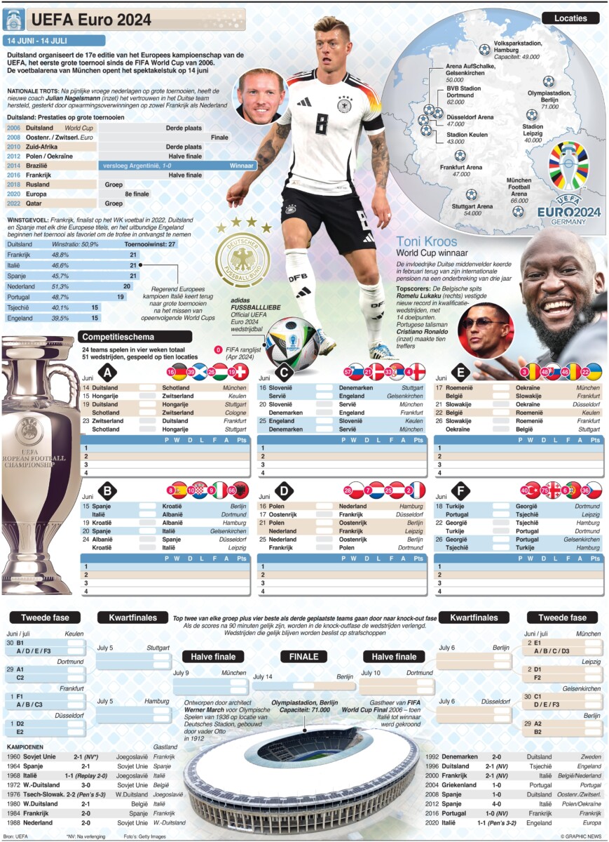 14 juni 2024 – 14 juli 2024 – Duitsland is gastheer van de 17e editie van de UEFA European Championships, het eerste grote toernooi sinds de FIFA Wereldbeker 2006. De voetbalarena van München lanceert het paradepaardje op 14 juni.