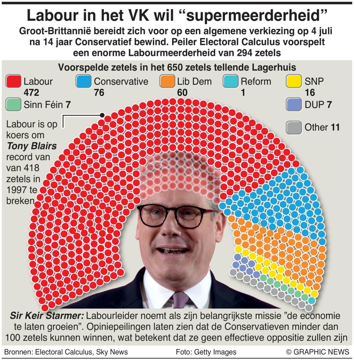 13 juni 2024 – Groot-Brittannië bereidt zich voor op de algemene verkiezingen op 4 juli, na 14 jaar conservatief bewind. Pollsters Electoral Calculus voorspellen een enorme Labour-meerderheid van 294 zetels.