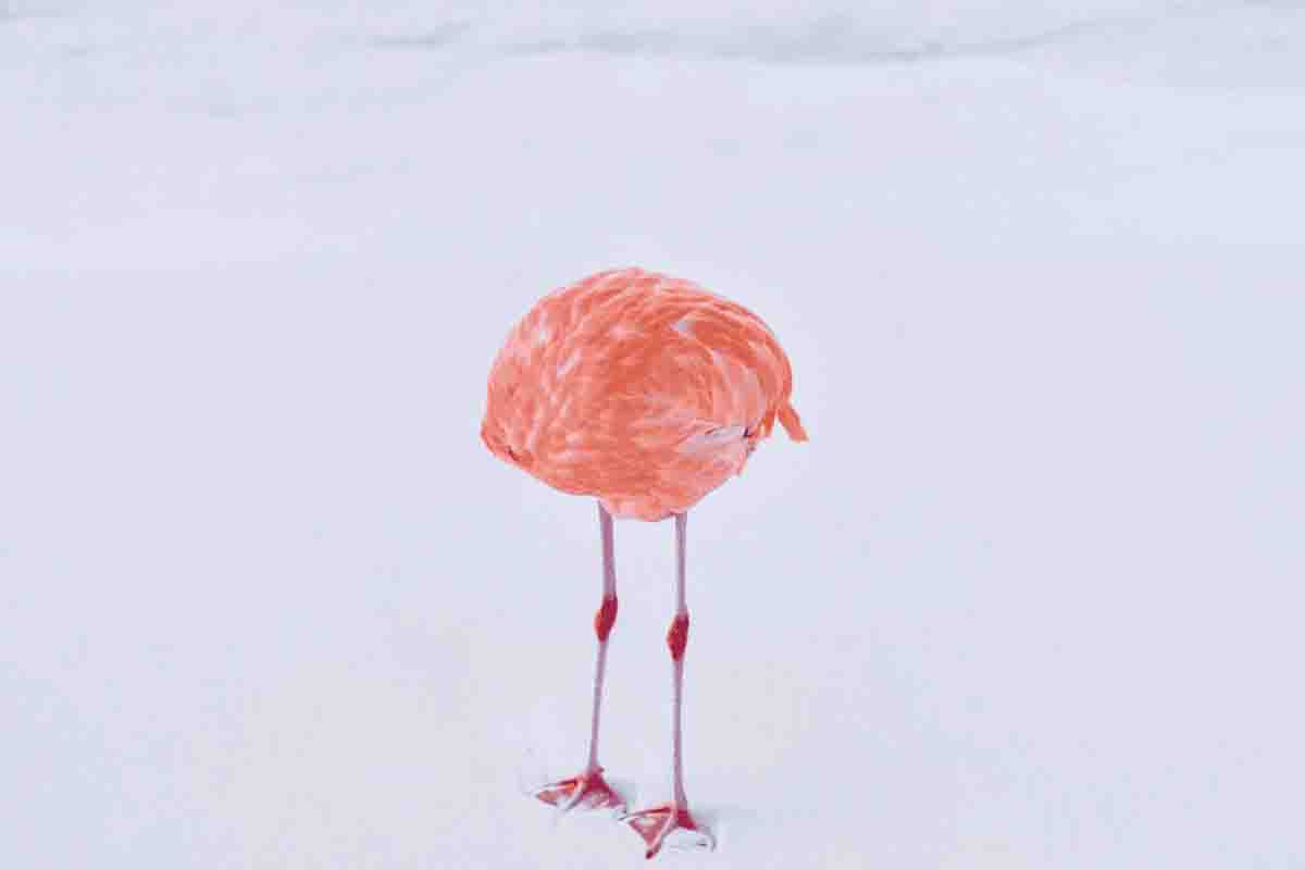 Op de foto buigt de vogel zijn nek om zichzelf met zijn snavel te krabben. Daardoor lijkt het alsof de flamingo geen kop heeft en als het ware een bolletje roze veren op poten is.