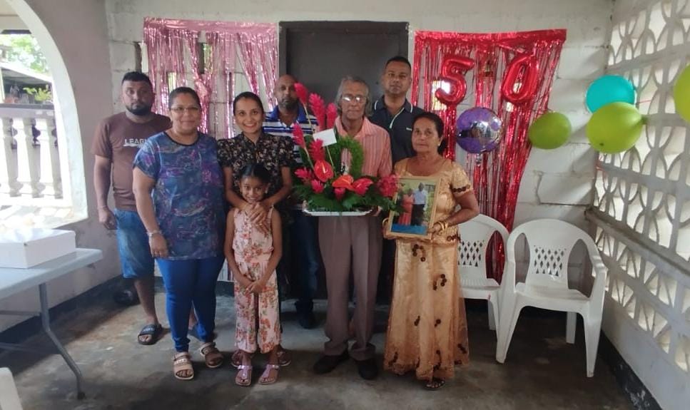 Namens districtscommissaris Mohamed Shafiek Goelaman van Wanica Zuid-Oost werd op 15 juni de felicitatie overgebracht aan het 50-jarig huwelijk echtoaar Loilargosain-Kalloe door de bestuursambtenaren.