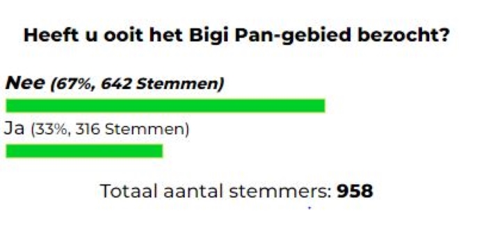 In een recente webpeiling van Dagblad Suriname werd gevraagd of lezers ooit het Bigi Pan-gebied hebben bezocht. Uit de resultaten bleek dat 67% van de respondenten (642 stemmen) nog nooit in het gebied is geweest.