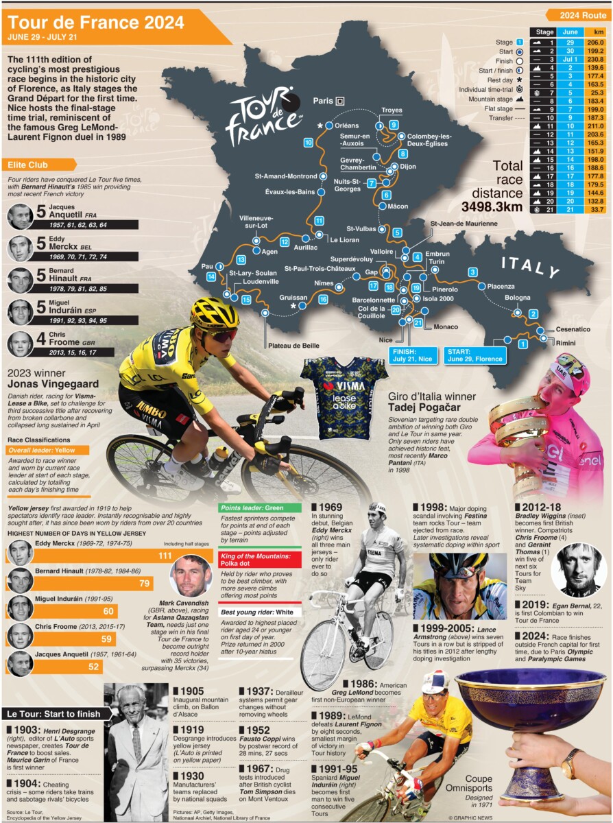 29 juni 2024 – 21 juli 2024 – De Tour de France begon in 1903 als een manier om de verkoop van een sportkrant te stimuleren, maar werd al snel op zichzelf populair. De 111e editie van de meest prestigieuze wielerwedstrijd begint in de historische stad Florence, terwijl Italië voor het eerst de Grand Départ organiseert. Nice is gastheer van de tijdrit in de slotfase, die doet denken aan het beroemde duel tussen Greg LeMond en Laurent Fignon in 1989.